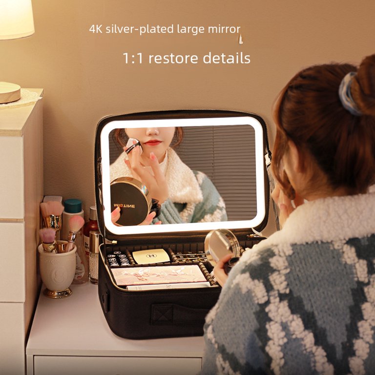 Imagina que estás de viaje o preparándote en casa. En lugar de buscar una buena luz, simplemente abres tu cosmetiquera. Todo tu maquillaje está en su sitio y el espejo te da la iluminación ideal. Es la comodidad de tener tu tocador personal contigo.