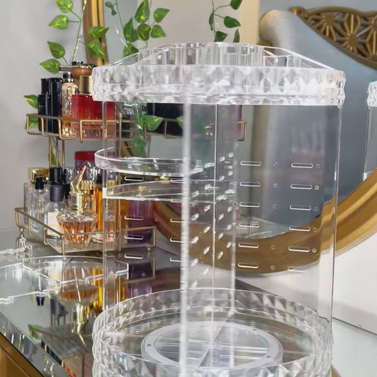 ¿Cansada de buscar entre el desorden de tu tocador? Este organizador giratorio es la solución ideal para tener todos tus cosméticos visibles y siempre al alcance de la mano.